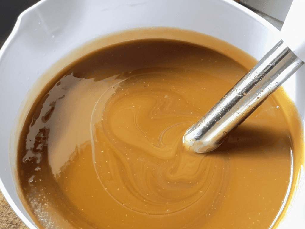 - Blend the soap mixture until it reaches the trace stage. You will know you’ve achieved this stage when you drizzle the soap batter onto itself and it creates a line that briefly remains on the surface of the mixture for a second or two.