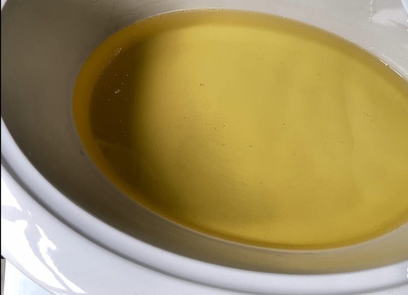 Pour your lye solution into the melted oils slowly. Use your stick blender to mix until you reach trace (the point when your soap batter is thick like pudding).